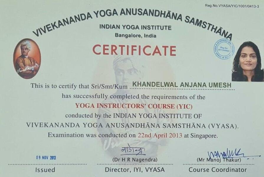 500-hour Yoga Instructor Training, Completed in April 2013 from VYASA YOGA, Singapore